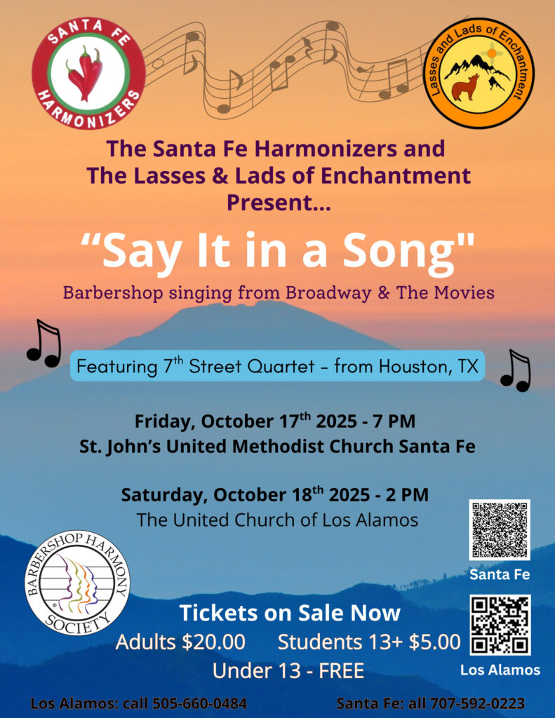 The Los Alamos Lasses and Lads of Enchantment and the Santa Fe Harmonizers under the direction of Maurice Sheppard once again join forces to present this year’s Annual Barbershop Harmony Show, “Say it with a Song”. Please note that only one show will be held in Santa Fe and only one show will be held in Los Alamos. The Santa Fe show will be presented Friday, October 17 at 7:00 PM at St. John’s United Methodist Church, 1200 Old Pecos Trail, and the Los Alamos show will be a matinee presented Saturday, October 18 at 2:00 pm at the United Church, 2525 Canyon Road.